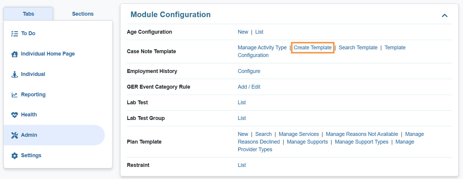 ১. Admin ট্যাব থেকে Case Note Template অপশনটির Create Template লিঙ্কটিতে ক্লিক করুন।