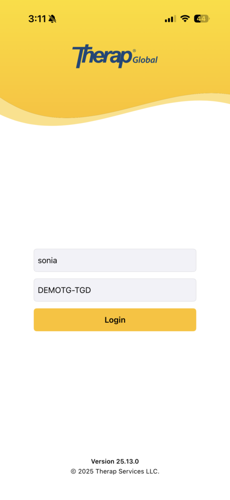 ১. Therap mobile application থেকে Login পেজে Login Name, এবং Provider Code পূরণ করুন এবং Login বাটন ট্যাপ করুন।