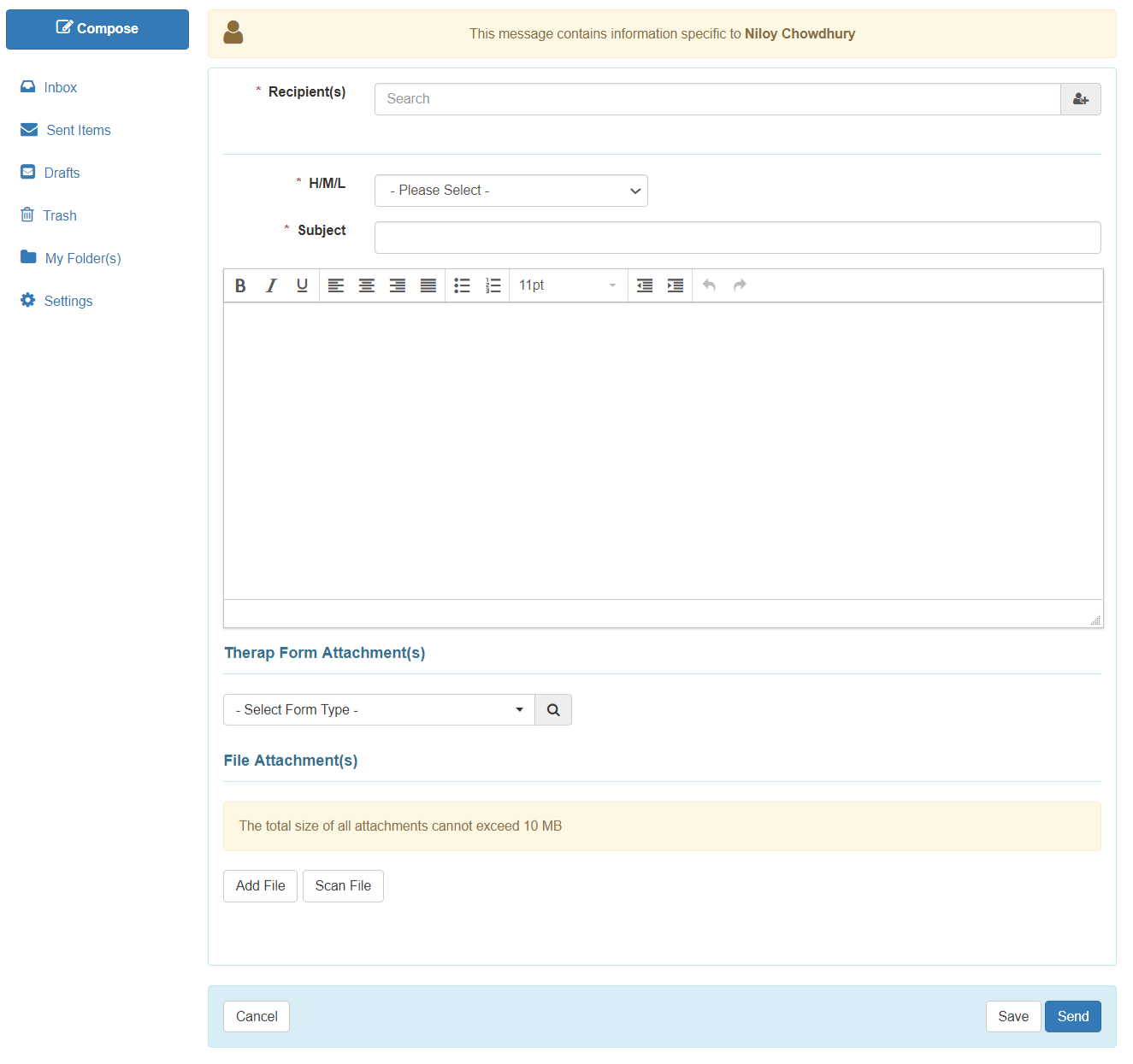 4. On the Compose page, Recipient(s), H/M/L, Subject and the Message fields are mandatory and must be completed.
