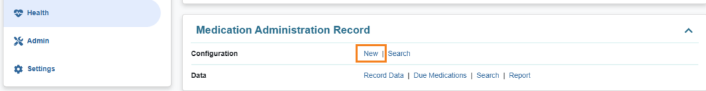 1. On the Health tab, click on the New link beside the Configure option under the Medication Administration Record section.