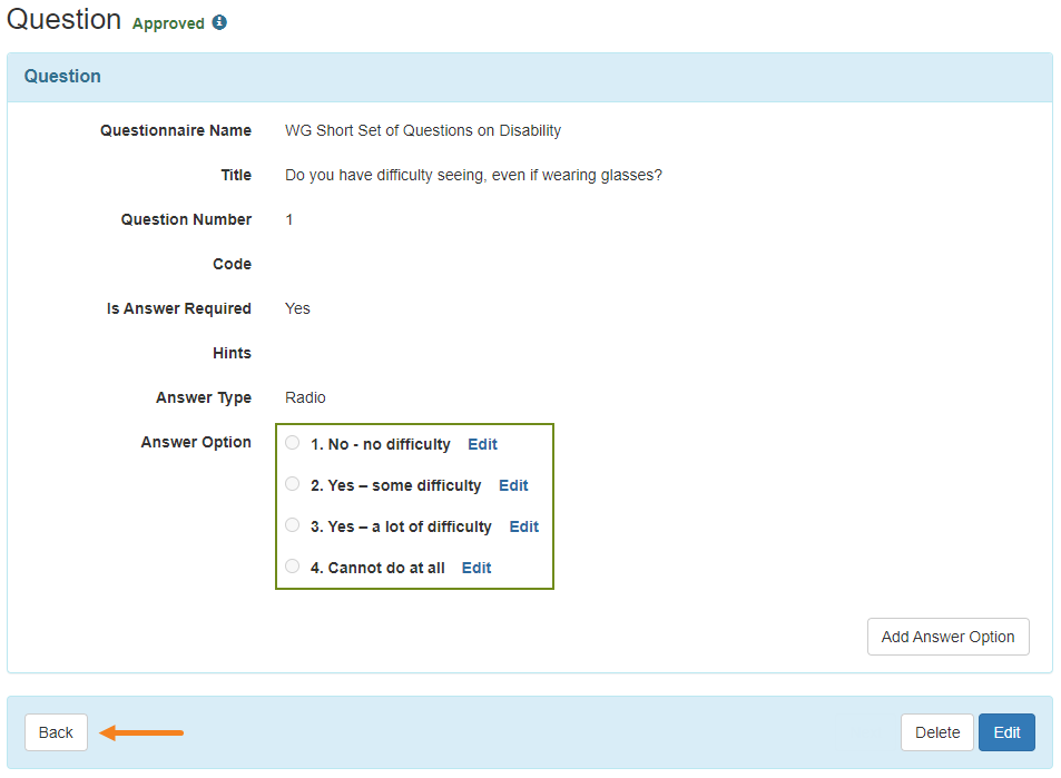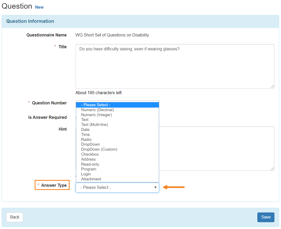 9. The format in which the answer options will be displayed on the Questionnaire depends on the particular Answer Types that you selected. You may edit the entered answer option(s) and continue to add more if needed. Clicking the Back button will take you to the Questionnaire page.
