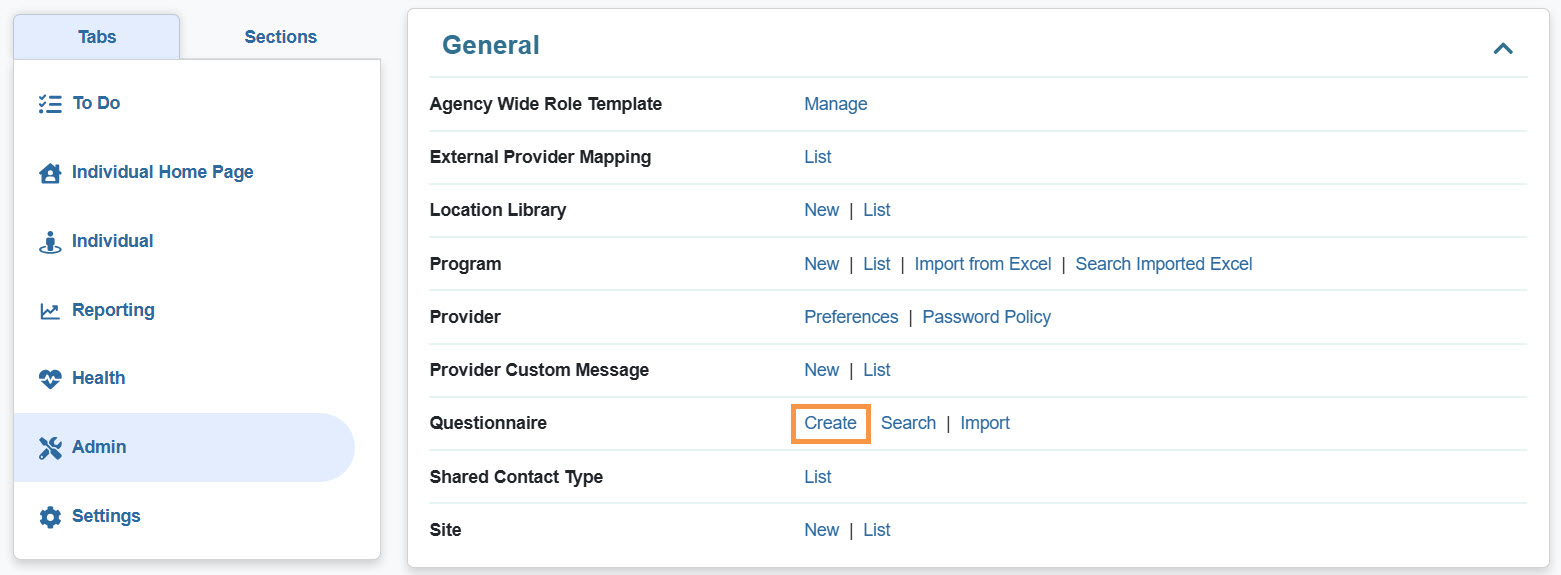 1. Click on the Create link next to the Questionnaire option from the Admin tab.