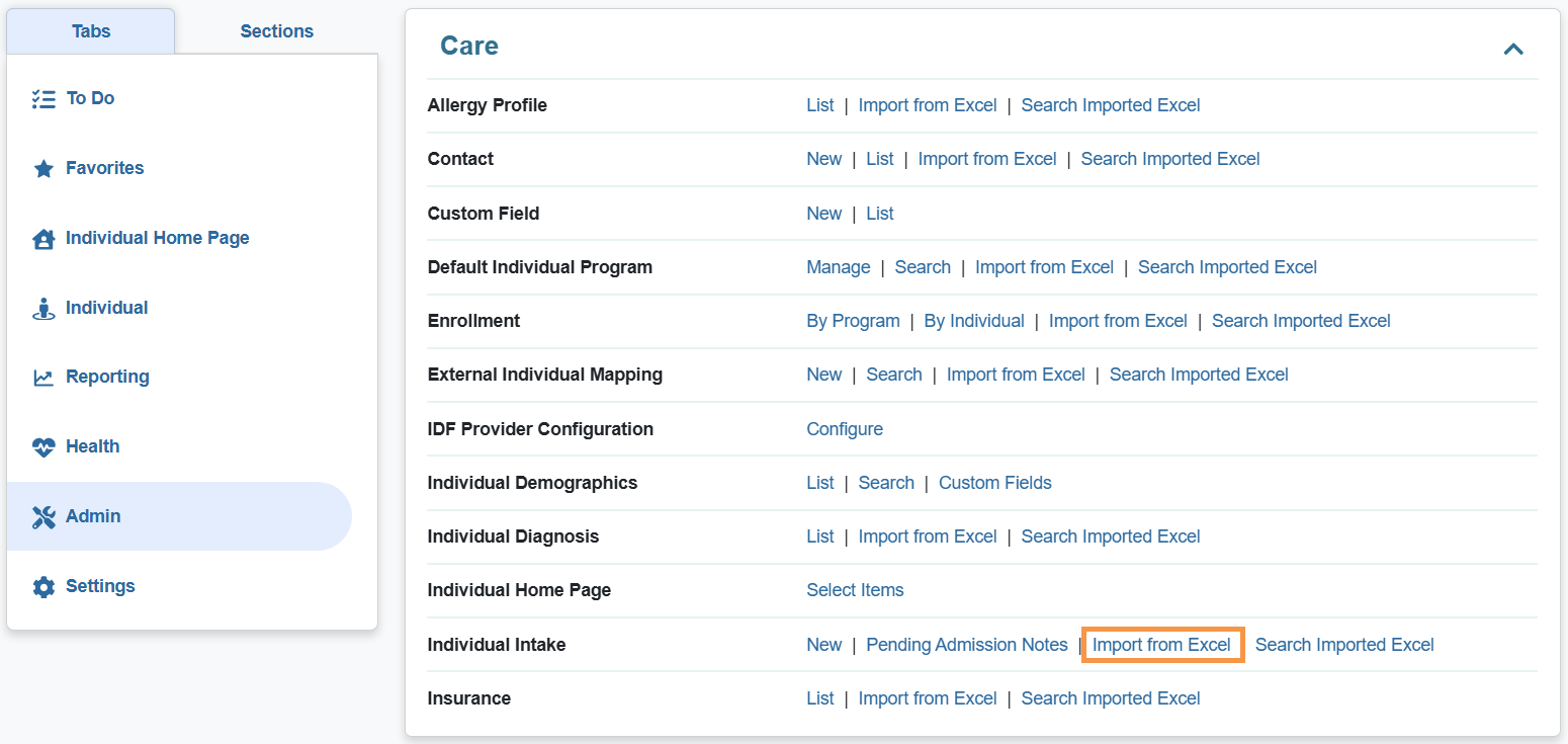 1.Click on the Import from Excel link beside the Individual Intake option on the Admin tab.