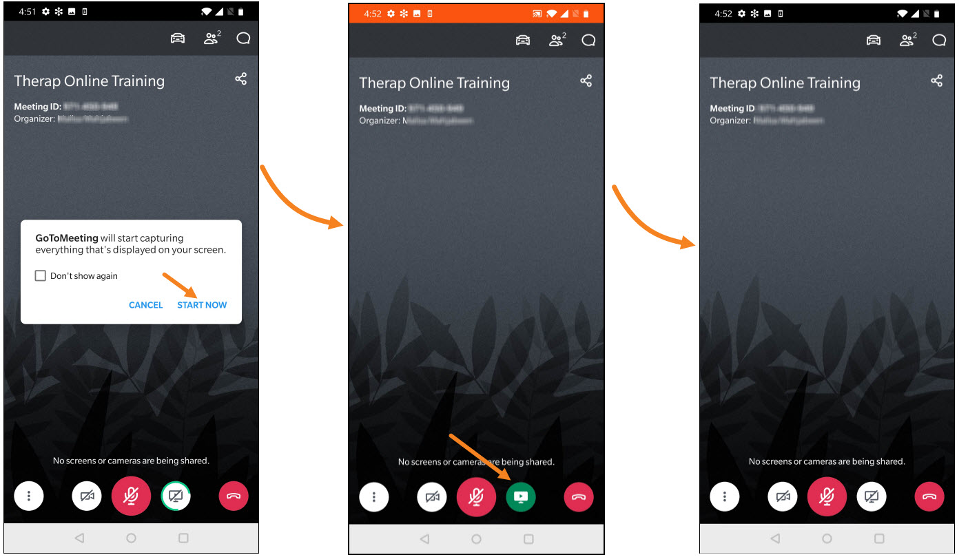 5. Screen Sharing: You will only be able to share your phone/tab screen in GotoMeeting app only if the Therap expert makes you a presenter. After Therap expert makes you a presenter you will get this “ GoToMeeting will start capturing everything that’s displayed on your screen”. Click on START NOW to start sharing your screen. To stop presenting/sharing your screen click on the green screen icon.