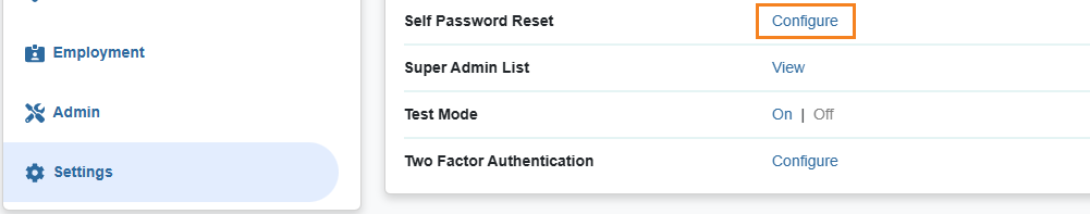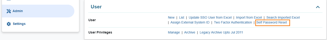 1. Click on the Self Password Reset option beside User under Admin tab