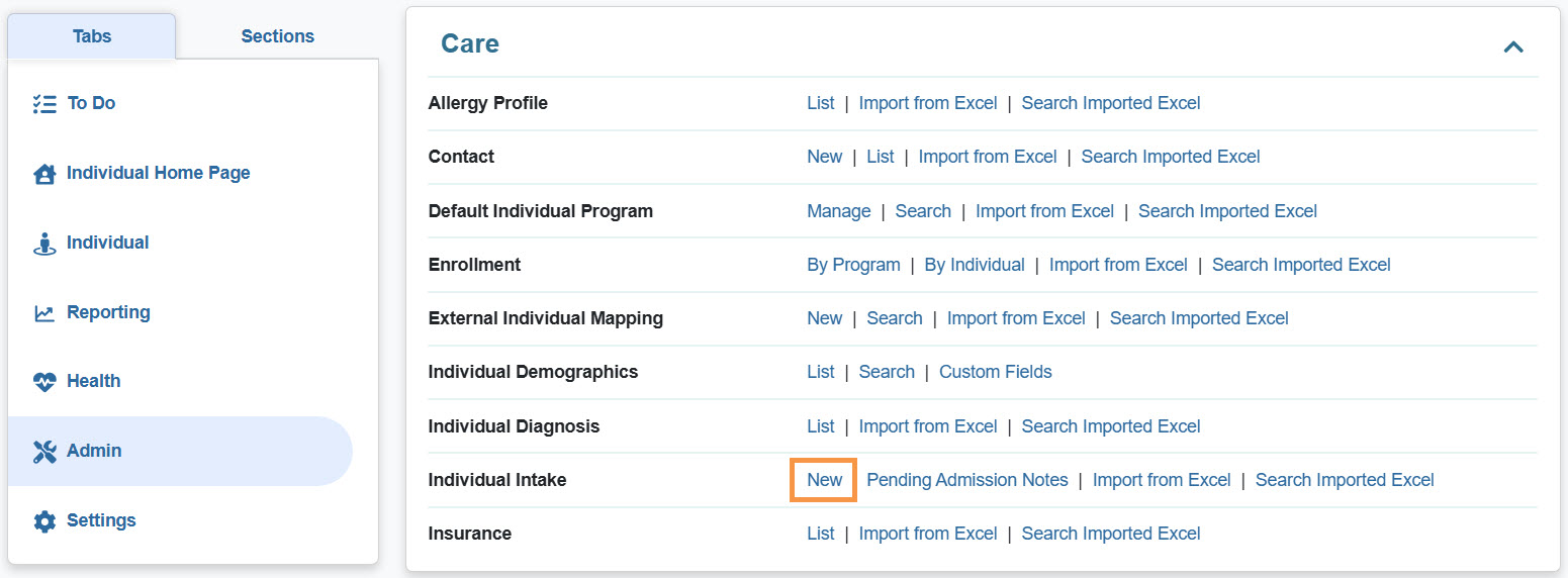 1. Sa Admin tab, i-click ang New link sa hilera ng Individual Intake sa ilalim ng Care section.