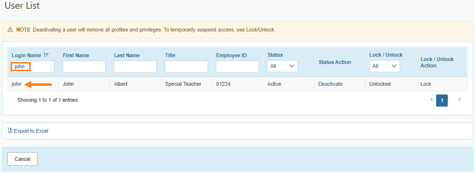 Kumbuka: Watumiaji hawataweza kuhariri sehemu za User Initials, Login Name, Status na Self Enroll Account.