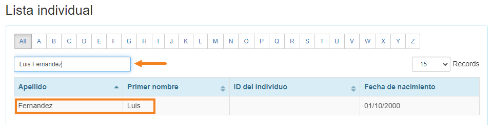 3. En la página Individual List (Lista Individual), seleccione la persona específica.