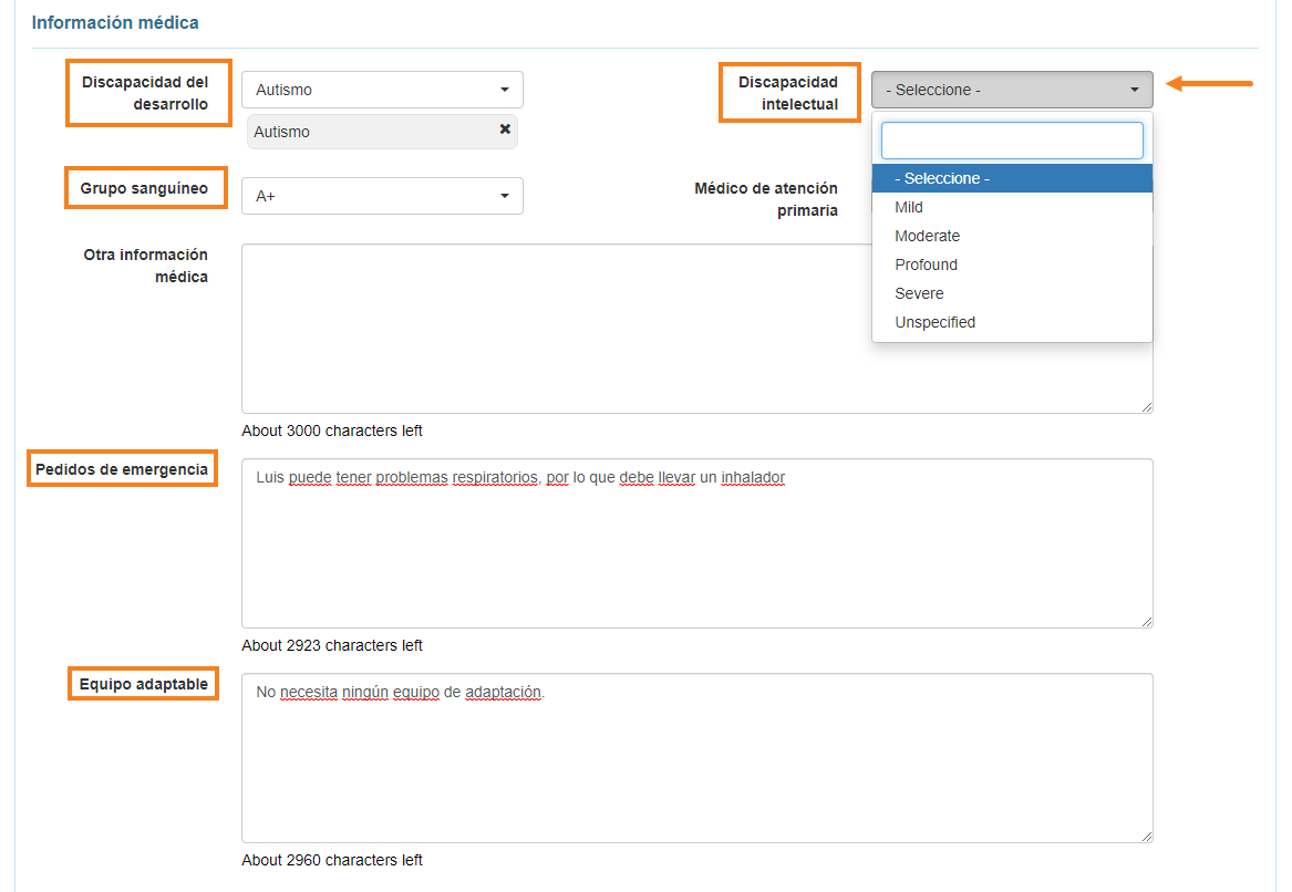 - Medical Information (Información médica): esta sección, que es opcional, le permite ingresar la información básica necesaria para la atención médica de la persona. En esta sección se puede ingresar Developmental Disability, Intellectual Disability, Blood Type, Emergency Orders, Adaptive Equipment (Discapacidad del desarrollo, discapacidad intelectual, Grupo sanguíneo, Pedidos de emergencia, Equipo adaptable), etc.