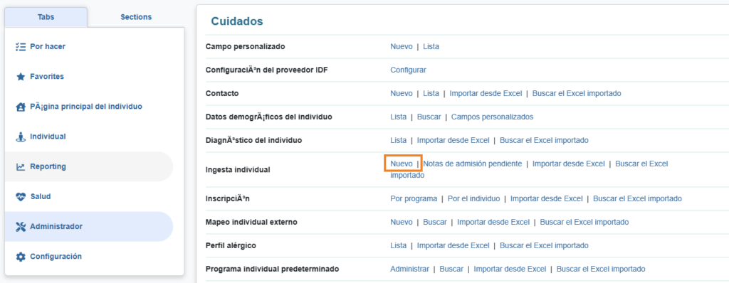 1. En la pestaña Admin (Administrador), haga clic en el enlace New (Nuevo) junto a Individual Intake(Ingesta Individual) en la sección Care (Cuidados).